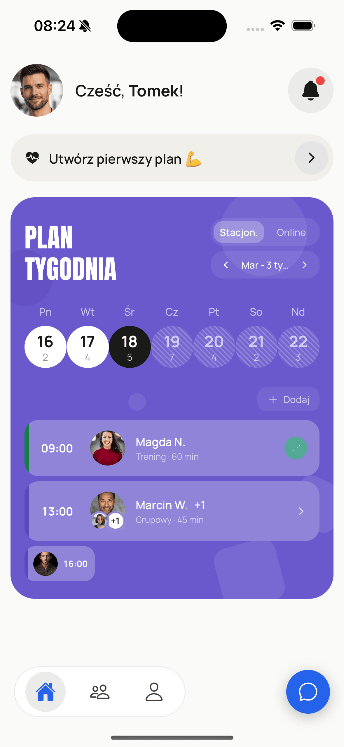 Plan tygodnia, sesje i lista podopiecznych na jednym ekranie. Od razu widzisz, kto trenuje dziś, kto ma zaległe raporty i co wymaga Twojej uwagi.