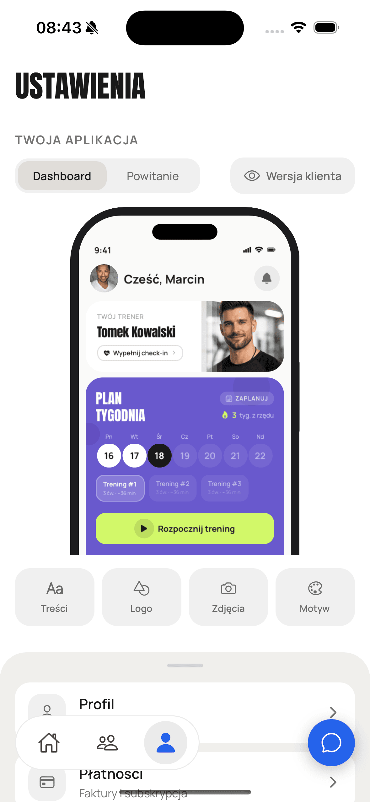 Od splash screena po zdjęcie na ekranie — klient widzi Twoją nazwę i kolory. Żaden inny trener w jego otoczeniu nie ma czegoś takiego. To doświadczenie, które zapamiętuje.