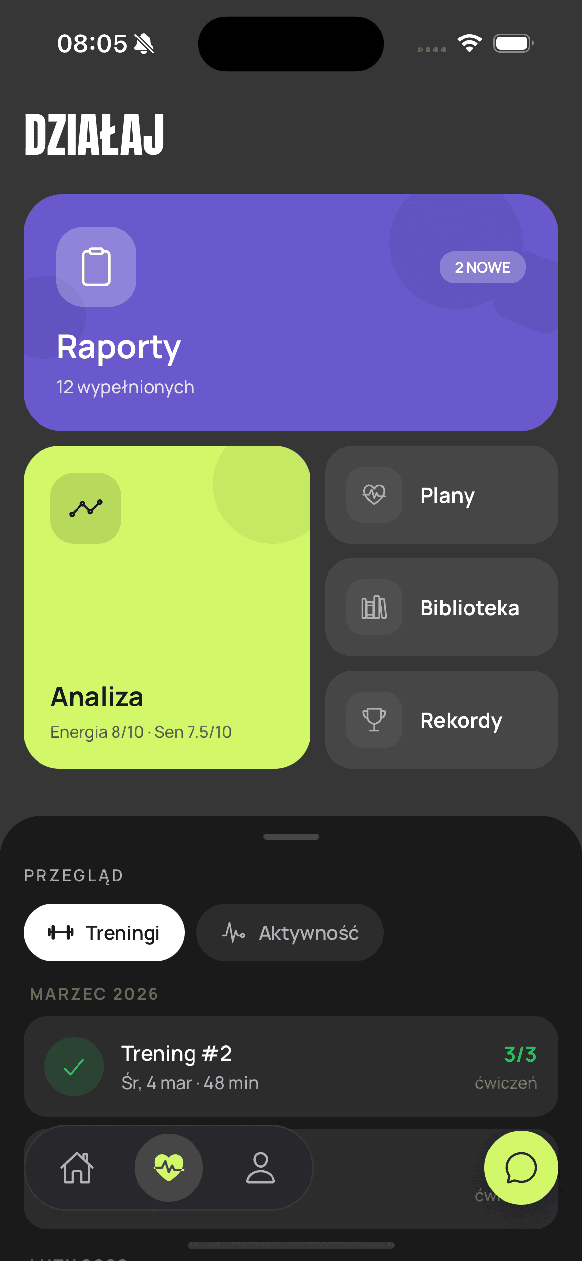 Plany, czat, raporty, postępy i historia klienta — wszystko w jednym miejscu. Otwierasz jedną aplikację i masz pełny obraz każdego podopiecznego.