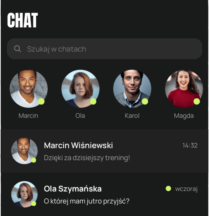 Klient pisze do trenera wprost z aplikacji — bez przeskakiwania na WhatsApp czy Messenger. Może dołączyć zdjęcie, a trener widzi jego plan i raporty obok rozmowy.