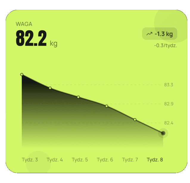 Spadek wagi na wykresie, nowy rekord w martwym ciągu. System śledzi kamienie milowe i generuje podsumowania, które motywują do dalszej pracy.