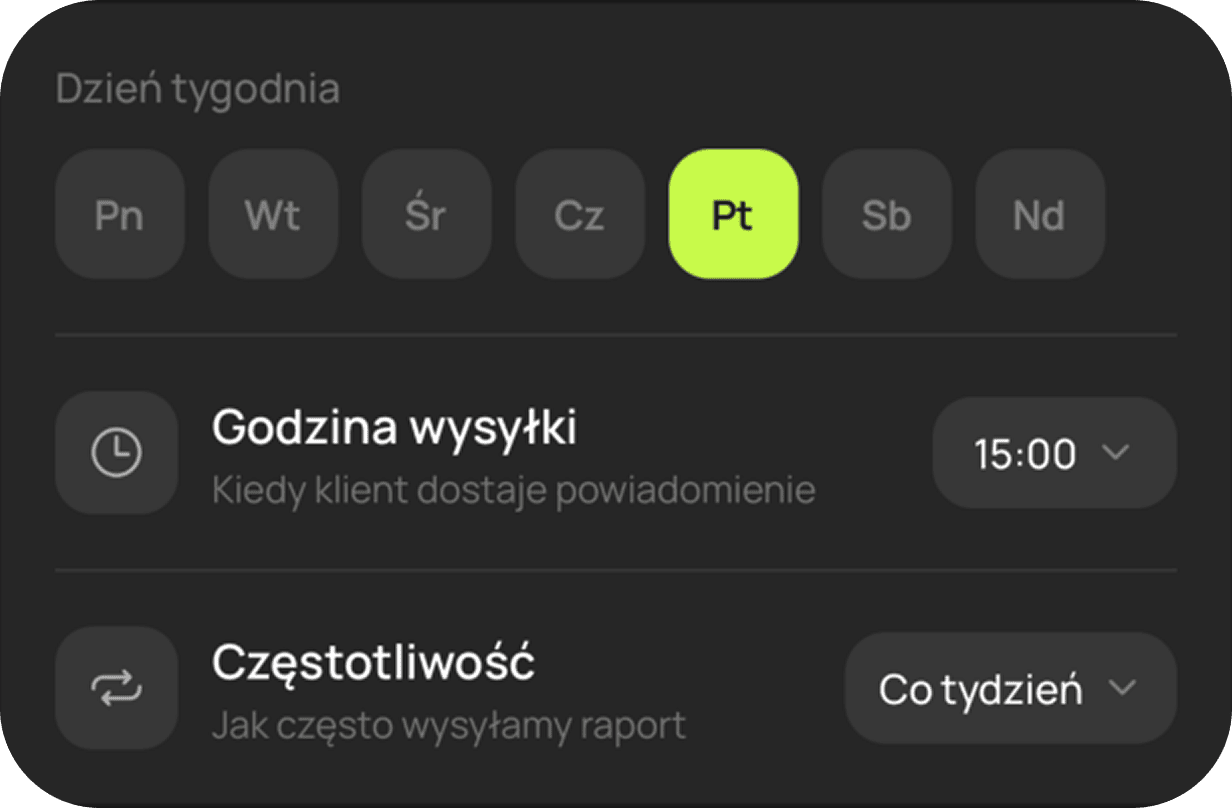 Ustawiasz raz: dzień treningu, dzień raportu, pora przypomnień. System wysyła powiadomienia push i pilnuje terminów — nawet gdy Ty jesteś offline.