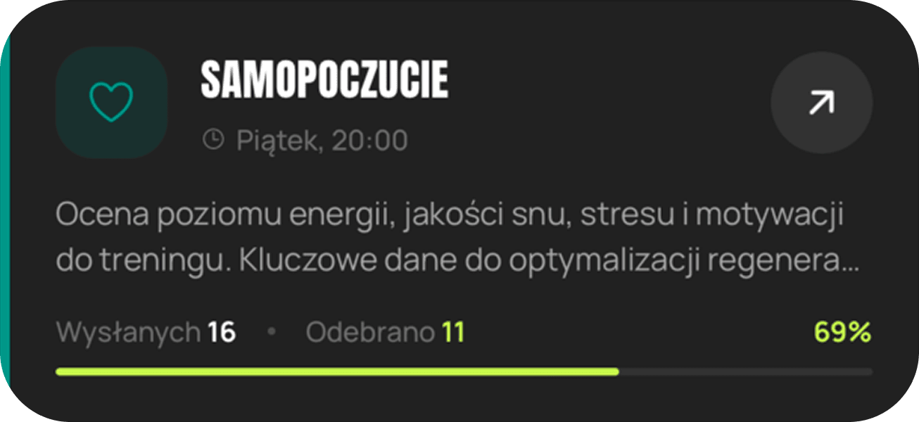 Klient wypełnia check-in w 90 sekund — wagę, pomiary, samopoczucie, zdjęcia. Ty widzisz trendy tydzień do tygodnia. Zero ręcznej roboty.